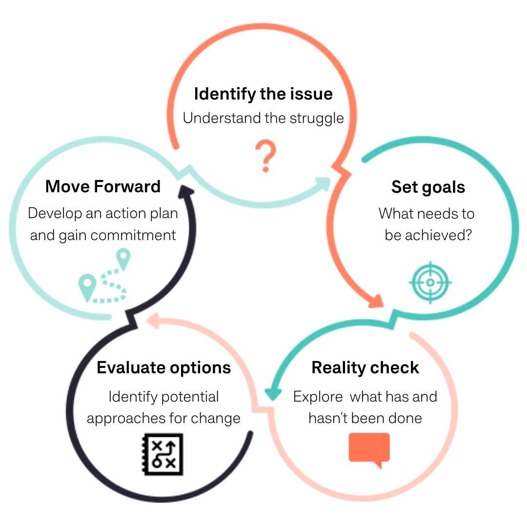 It’s also helpful to use a framework to ensure your coaching conversations are not just inquisitive, but also leading to change, action and development.